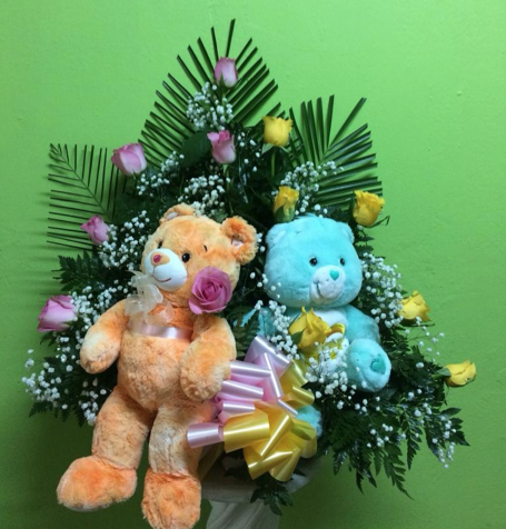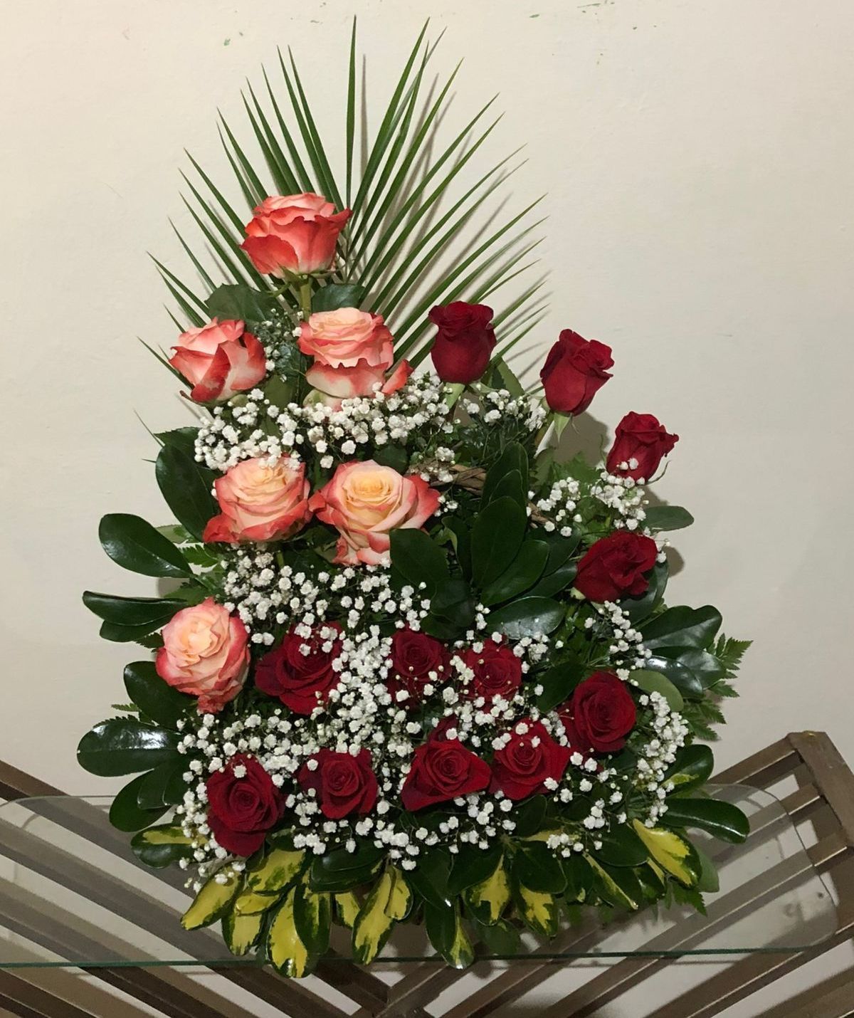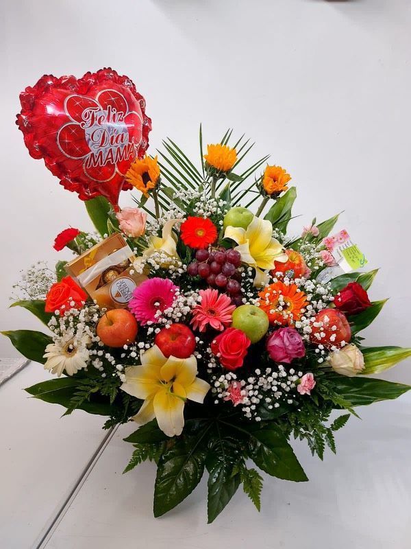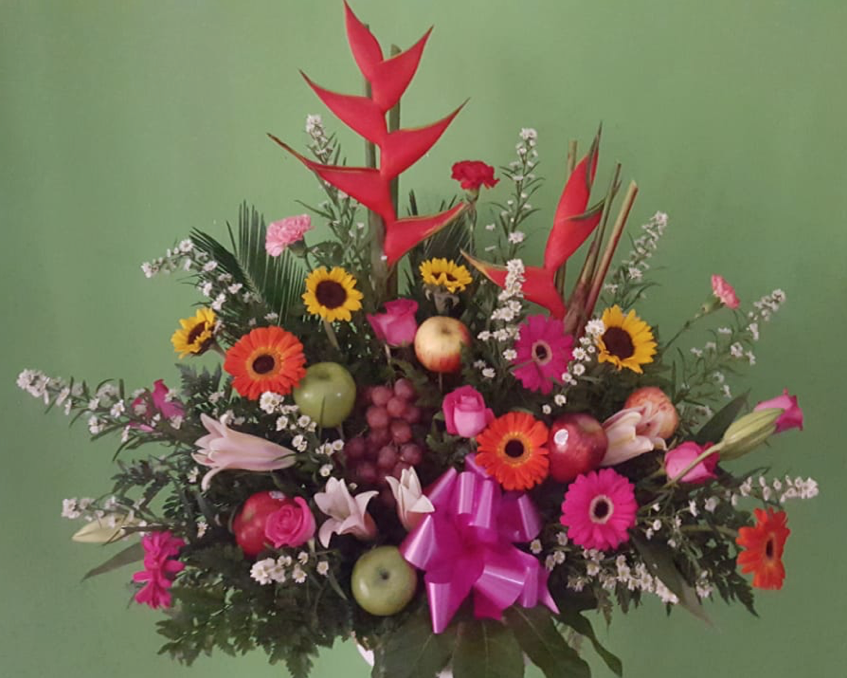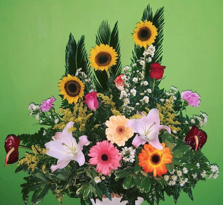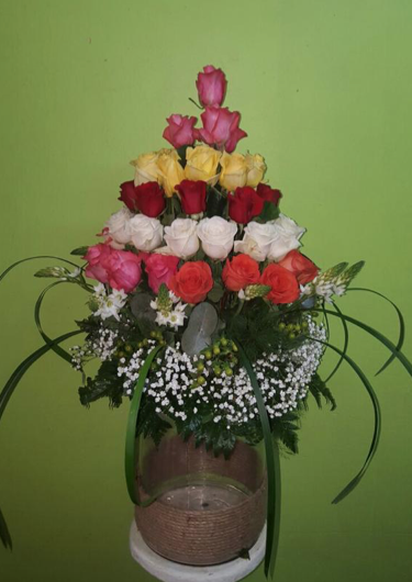 Arreglo de rosas de colores con borde de aralias.