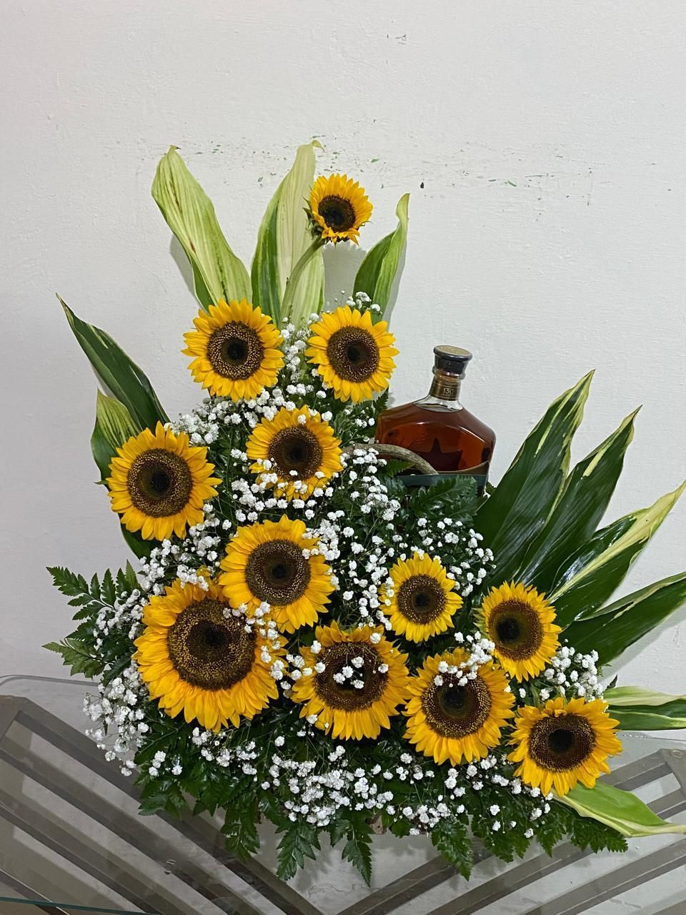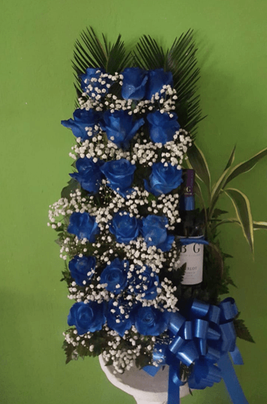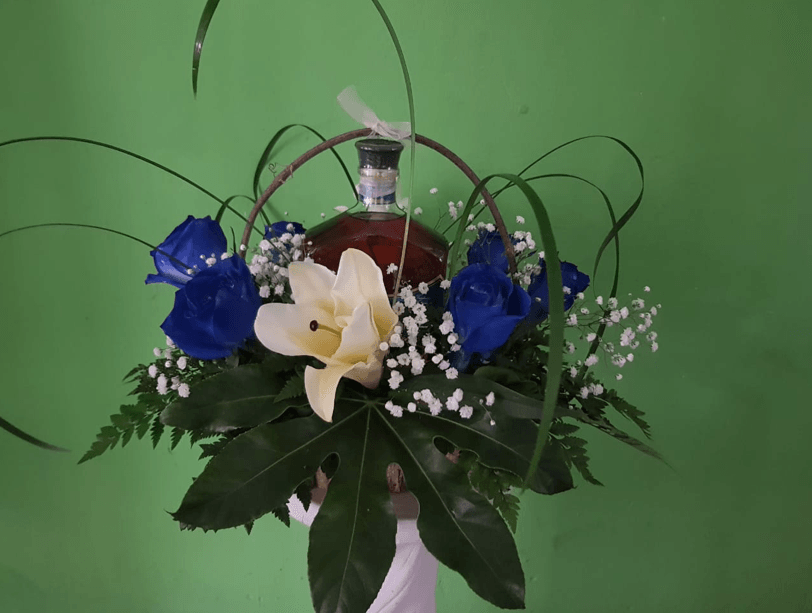 Arreglo moderno unisex con botella de vino.