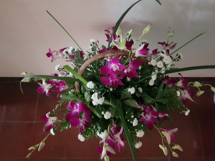 Canasta rústica de orquídeas púrpuras.