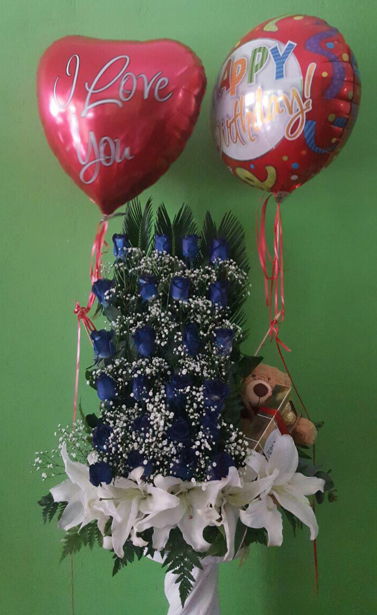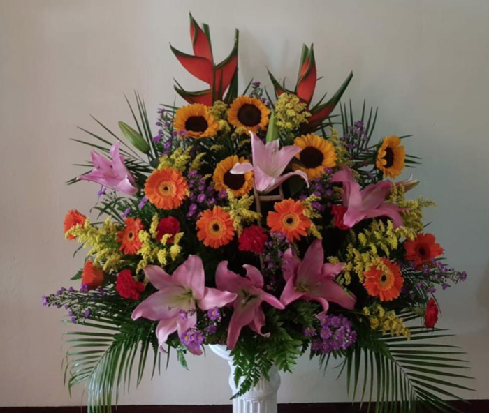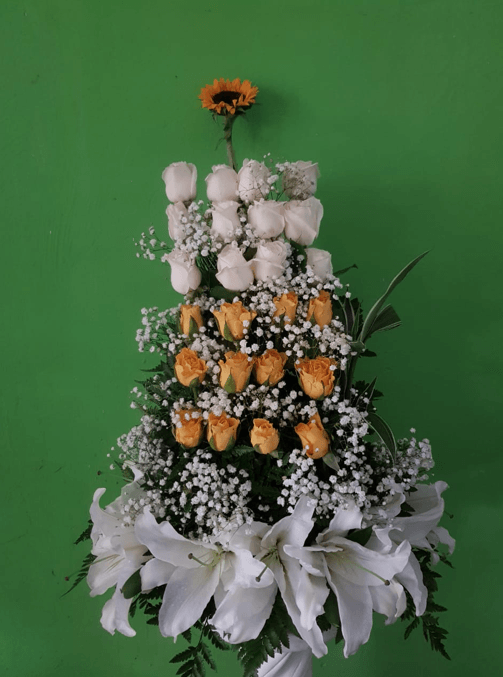 Arreglo moderno en escalera con lirios en la base.
