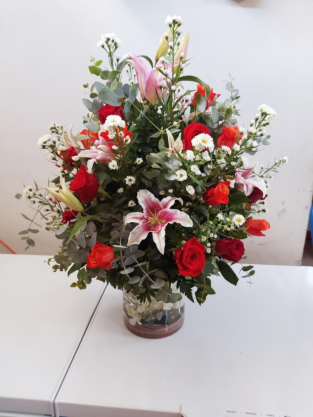 Arreglo redondo de rosas variadas.